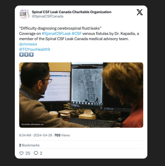 Within days of our story airing on CTV News, I received numerous emails and messages from patients all across Canada asking for help to see Dr. Kapadia at Sunnybrook hospital, he is now in demand with a high rate of success. He is doing phenomenal work with patients suffering from CSF leaks, he is extraordinarily talented and very compassionate. He was the first doctor to really listen and believe in me. I am incredibly grateful that I found him.